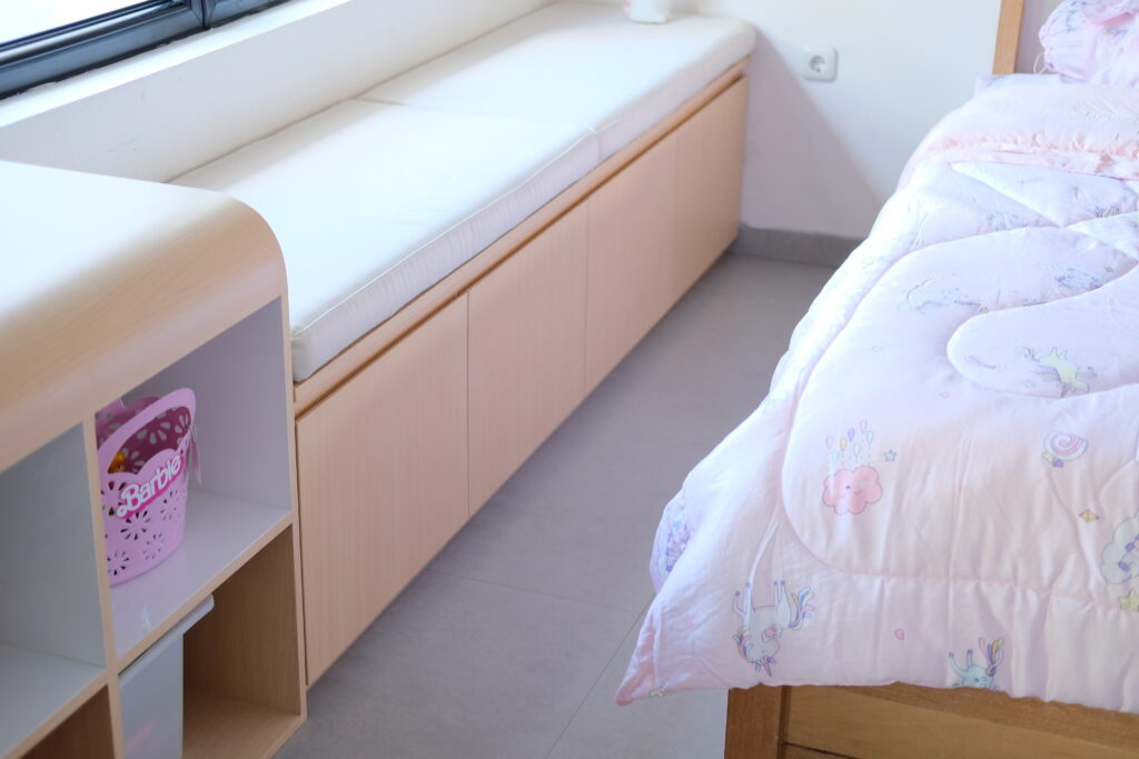Kamar tidur anak dengan tempat tidur, area belajar, dan playground dalam satu struktur.